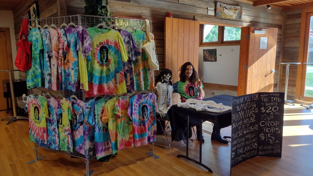 Maddi Mae’s husband Damian has outdone himself with a Sydney the skeleton block print, hand-drawn and hand-carved. We’ve used this block to print truly one-of-a-kind shirts and tote bags. Snag a tie-dye t-shirt for $20, tied and dyed personally by Maddi Mae and Damian. Pick up a white crop-top for $15 and then pair it with your biggest pants and comfiest unbuttoned button downs. Get yourself a red or off-white cotton tote-bag for $5, perfect for lugging your sheet music to and from rehearsals. Buy a Sound House sticker for $2 and stick it on your favorite boring surface to make it less boring.