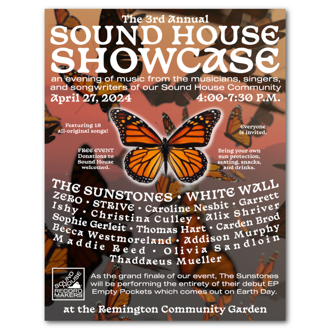 The Sound House Showcase is an opportunity for the musicians, singers, and songwriters in our community to perform in front of a live audience on an outdoor stage. Consider this an extra-special variation of the traditional recital. It’s an important evening for our whole Sound House community to get together, share songs, and strengthen our friendships. From children to adults, beginners to experienced players, everyone is welcome to sign up for the chance to perform live at the Remington Community Garden. For a better idea of what to expect (or just to reminisce), you can check out photos from our Sound House Showcases in 2022 and 2023.