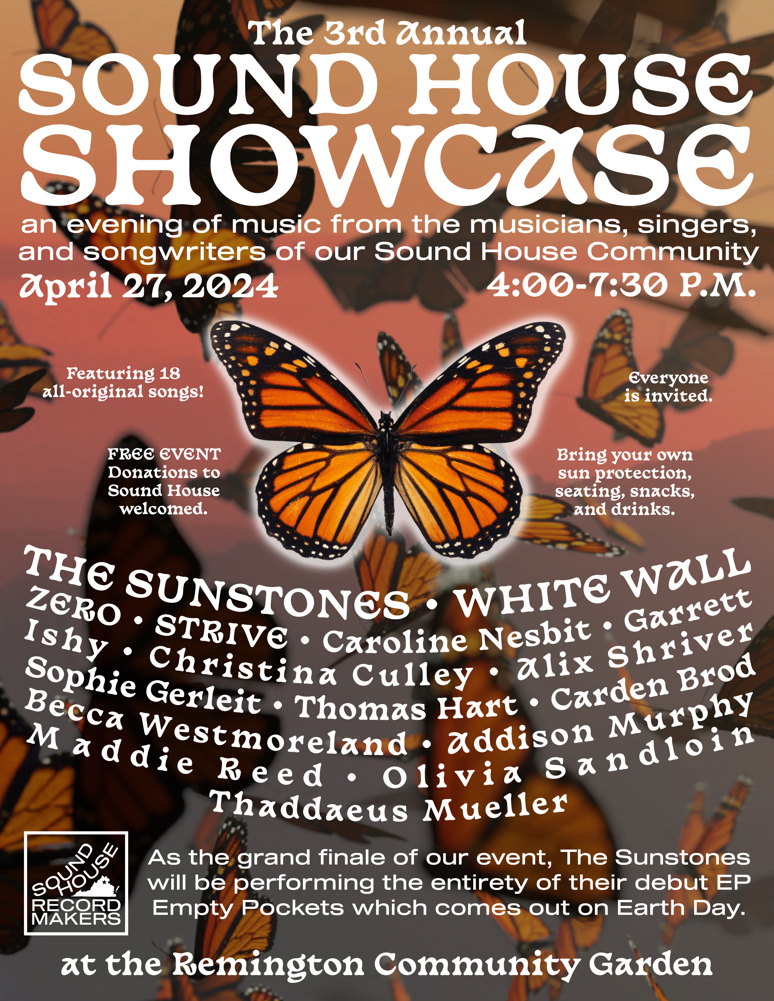 The 2024 Sound House Showcase (our 3rd annual iteration of this event) happened on Saturday, April 27th at the Remington Community Garden, 160 West Bowen Street. We made music from about 4:00 PM to 9:00 PM. Guests brought their own outdoor chairs, water, and snacks; they sang along and danced their booties off too.