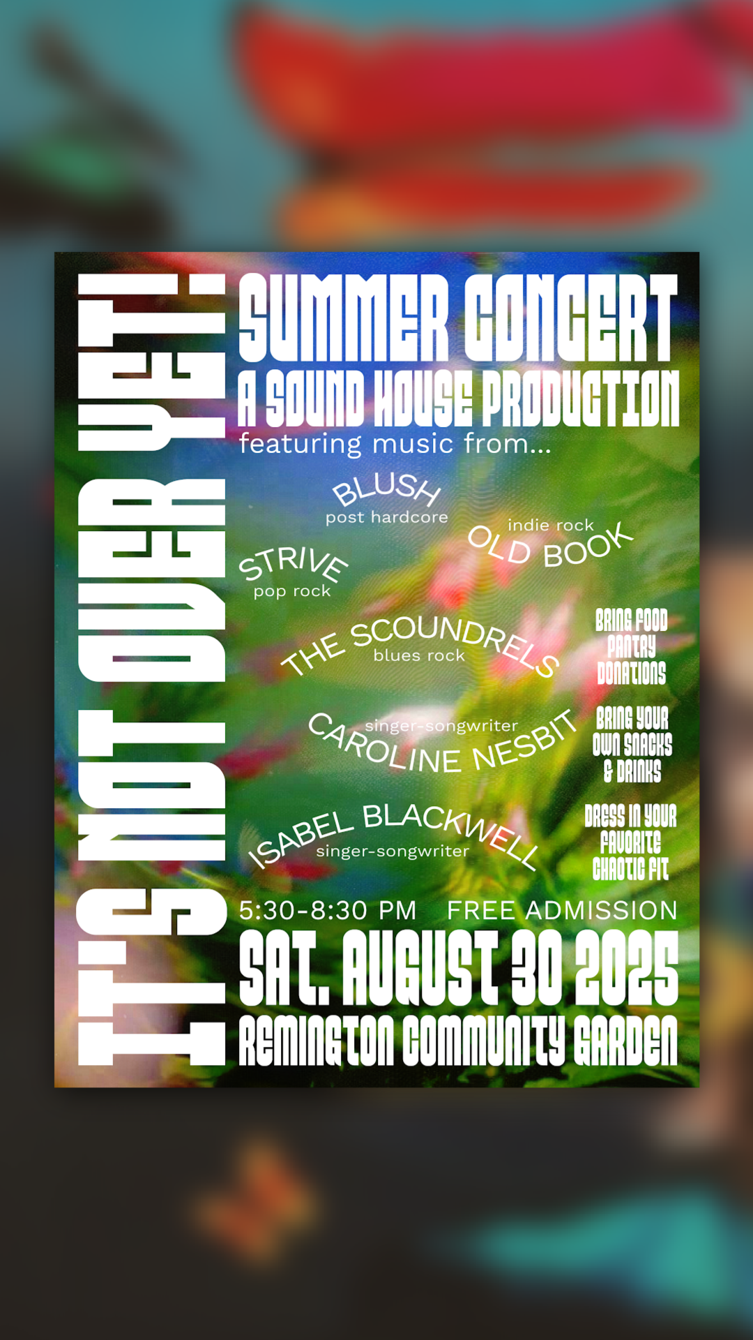 Summer isn’t over yet! Join us on Saturday, August 30, 2025 at the Remington Community Garden for a free concert featuring music from six local acts: StriVe, Blush, Old Book, The Scoundrels, Caroline Nesbit, and Isabel Blackwell. The show starts at 5:30 PM and should be over a little bit before 8:30 PM. Sound House wizard Maddi and her husband Damian are hosting the event; they request that those who are able to do so bring nonperishable food to help stock the local free pantry. You may also want to bring your own snacks and drinks (no alcohol per the Garden’s rules), your own comfy outdoor seating, and your dancing shoes. Favorite chaotic outfits are encouraged. Let this night of music refresh your soul and remind you that IT’S NOT OVER YET! We’ve got so much more in store.