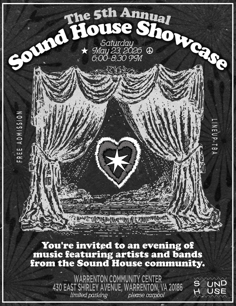 Our version of a studio recital, the Sound House Showcase is a free concert featuring performances by artists and bands who work on their music here at Sound House. This year is the 5th Annual Sound House Showcase, and we’ll be hosting it on Saturday, May 23rd, 6:00-8:30 PM at the Warrenton Community Center.