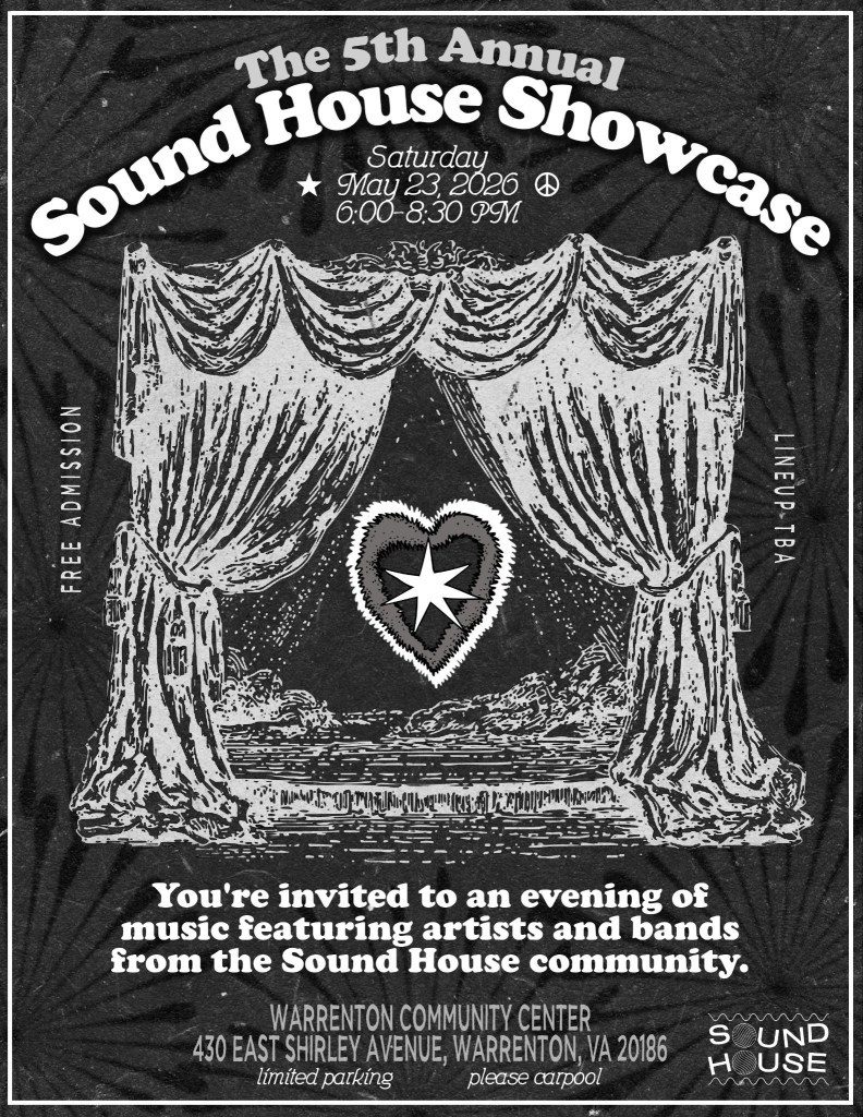 Applications to perform at the 5th Annual Sound House Showcase on Saturday, May 23, 2026 from 6:00-8:30 PM at the Warrenton Community Center are now available and due no later than Friday, April 10, 2026 at midnight. Here’s the link for the Showcase Application Form.