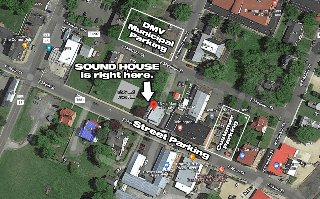 Plenty of parking is available behind Sound House at the DMV Municipal Parking Lot located on East Madison Street. There is a curving sidewalk between Sound House and the DMV/Town Hall that will take you to the studio’s front porch.